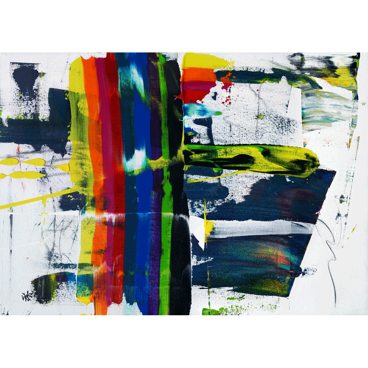 Anfangs zeichnete die Kohle ihre Spur auf den weißen Untergrund. Nebeneinander liegende Farbkleckse mit einer Kelle von oben nach unten zu einem Farbstreifen gezogen, unterbrechen als Senkrechte die Waagerechte. Diese Vertikale offenbart ein Farbspektrum von Gelb, Orange, Magenta, Rot, Türkis, Blau, Violett, Grün und Schwarz. Die Farben des Regenbogens oder der Sendepause werden durch Weiß unterbrochen und setzen sich weiter in der Horizontalen fort. Horizontale und Vertikale im Dialog. Die Horizontale steht für Ruhe und die Erde, die Vertikale für Bewegung und den Himmel. Sind wir fest mit dem Boden verbunden und gleichzeitig flexibel, bereit, in die Lüfte zu steigen?
