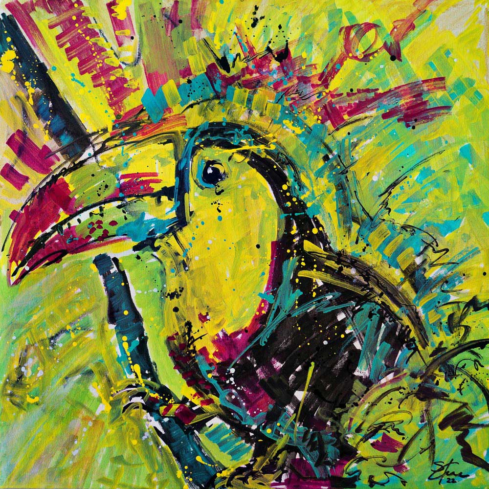 Die Grundlage besteht aus Grün- und Gelbtönen, aufgetragen mit Acrylstiften. Genauso wie der skizzierte Tukan mit seinem farbenfrohen Schnabel und dem schwarzen Körper. Wie lange kann dieser lebendige, verspielte, laute und gesellige tropische Vogel hier noch auf seinem Ast verweilen? In Gedanken versunken und melancholisch oder in Erwartung und voller Hoffnung? Die schwarzen Spritzer, die in freiem Flug ihren Platz gefunden haben, wirken wie ein Zeichen – eine Assoziation von Tränen. Wie lange kann er verharren, und wie lange werden wir Menschen noch zögern? Wie lange ermöglichen wir ihm noch, durch die Baumkronen Süd- und Zentralamerikas zu klettern?