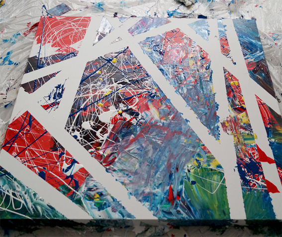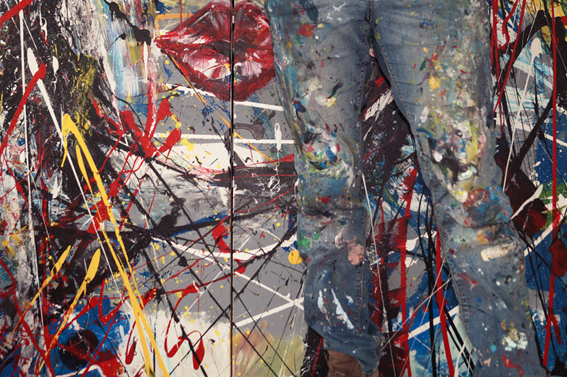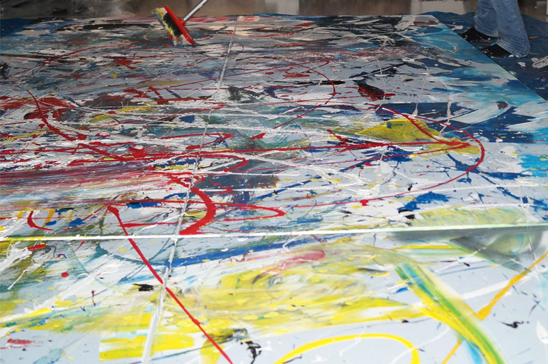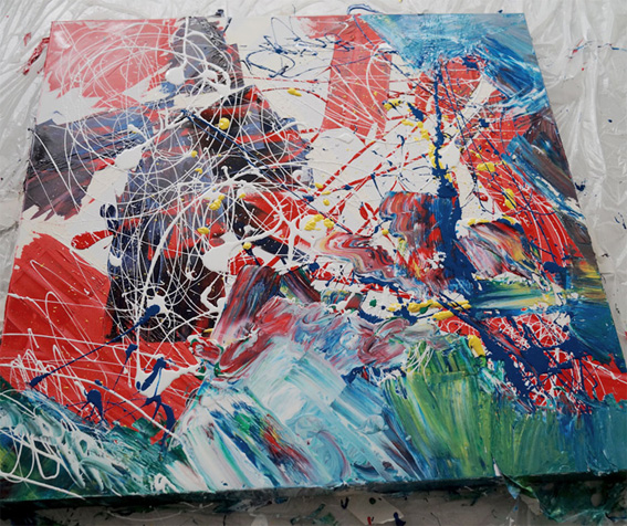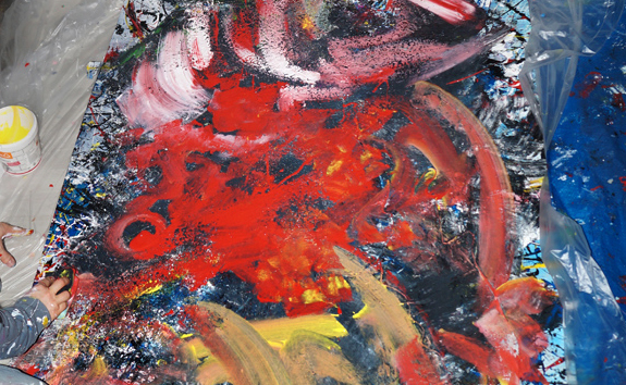 Zuerst kommt das pure Action Painting auf die Leinwand – durch verschiedene Techniken. Mehrere Farbschichten lagern übereinander und werden direkt aus der Tube, mit Spachteln, Pinseln und Löffeln aufgetragen. Die Farben bewegen sich zueinander, miteinander, gegeneinander und Gesichter, Figuren oder Formen fügen sich spielerisch ein.